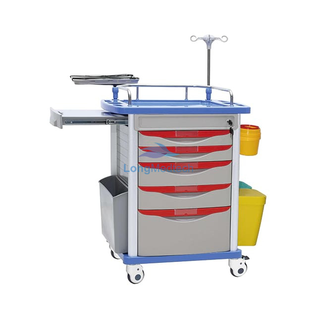 4. Right side of the vehicle: retractable infusion stand made of ABS engineering plastic material,can load 2-5KG,four revolving hooks (the infusion stand can be interchanged with the left platform),rotating 3-liter round sharps box,flip-top color separation trash can 175*175*280MM,two-color for garbage classification (yellow medical waste is harmful garbage,green domestic garbage is infectious garbage)