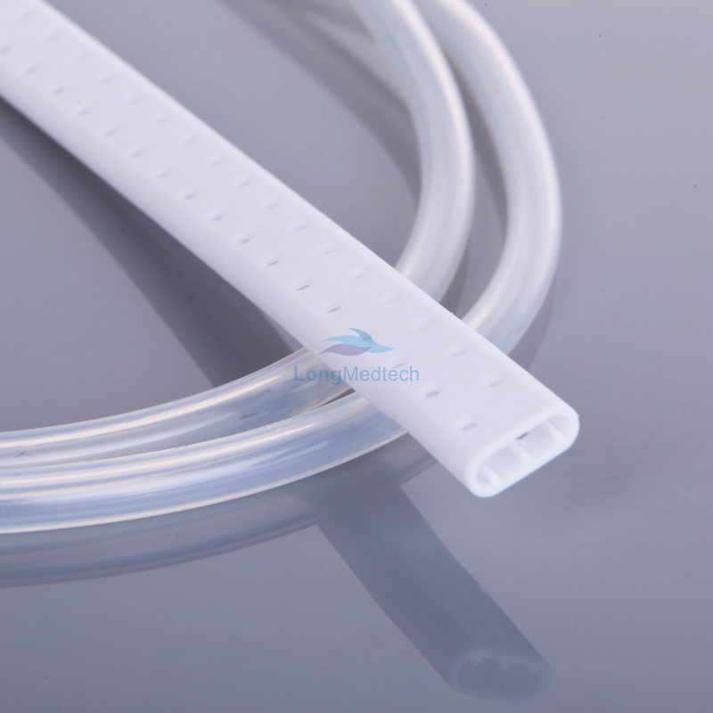 Combines a transparent silicone round tube and white perforated flat drain.
