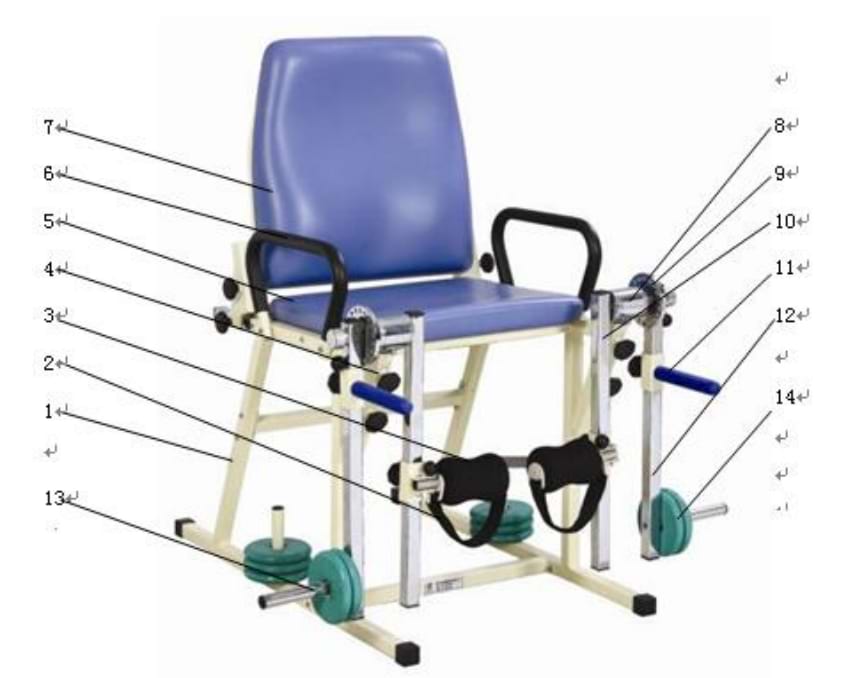 Le patient s'assoit sur le coussin du siège, les pieds en l'air, remet le coussin pour mollets dans sa position d'origine et le fixe avec des épingles. Placez l'avant ou l'arrière du mollet près du coussinet pour mollet, serrez-le modérément avec une sangle, ajustez l'angle du support de poids et le nombre de poids en fonction des besoins d'entraînement, et vous pouvez commencer l'entraînement.
